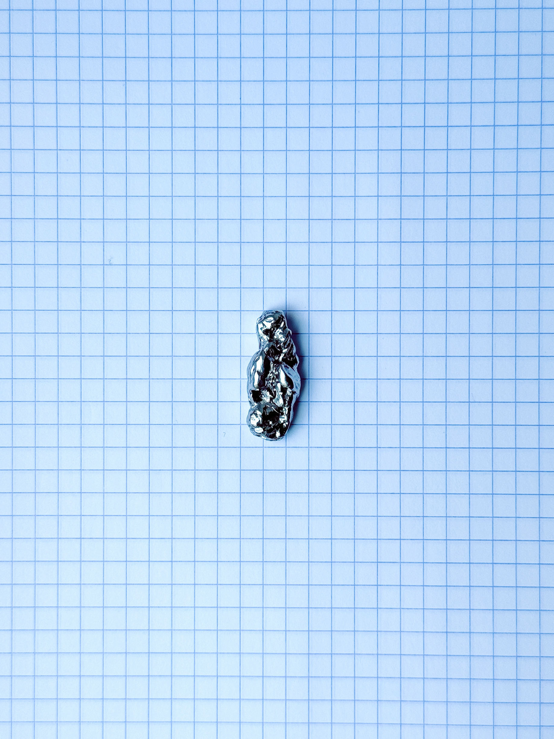 In this series of miniature sculptures, chewed gum — a material of fleeting, bodily intimacy — is transfigured into permanence through the casting of Chromium-Cobalt-Molybdenum alloy, an industrial metal known for its use in prosthetics and dental applications. What begins as a soft, disposable remnant of everyday consumption is solidified into an enduring relic, merging the organic gesture of the mouth with the precision of metallurgical craft.